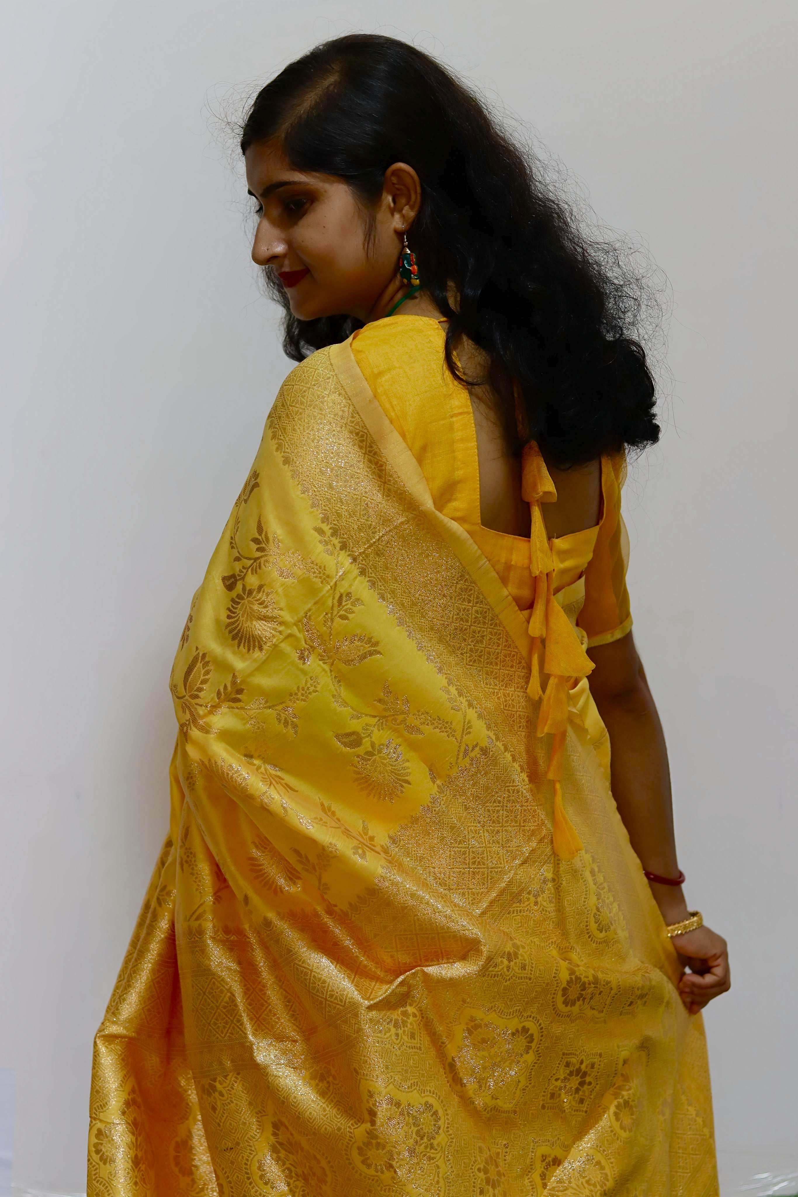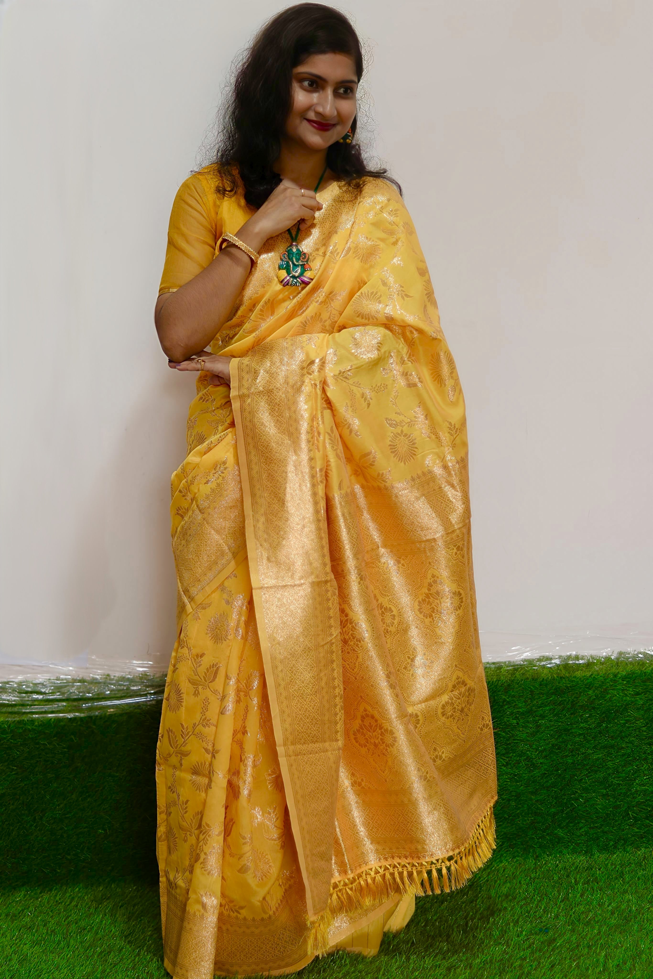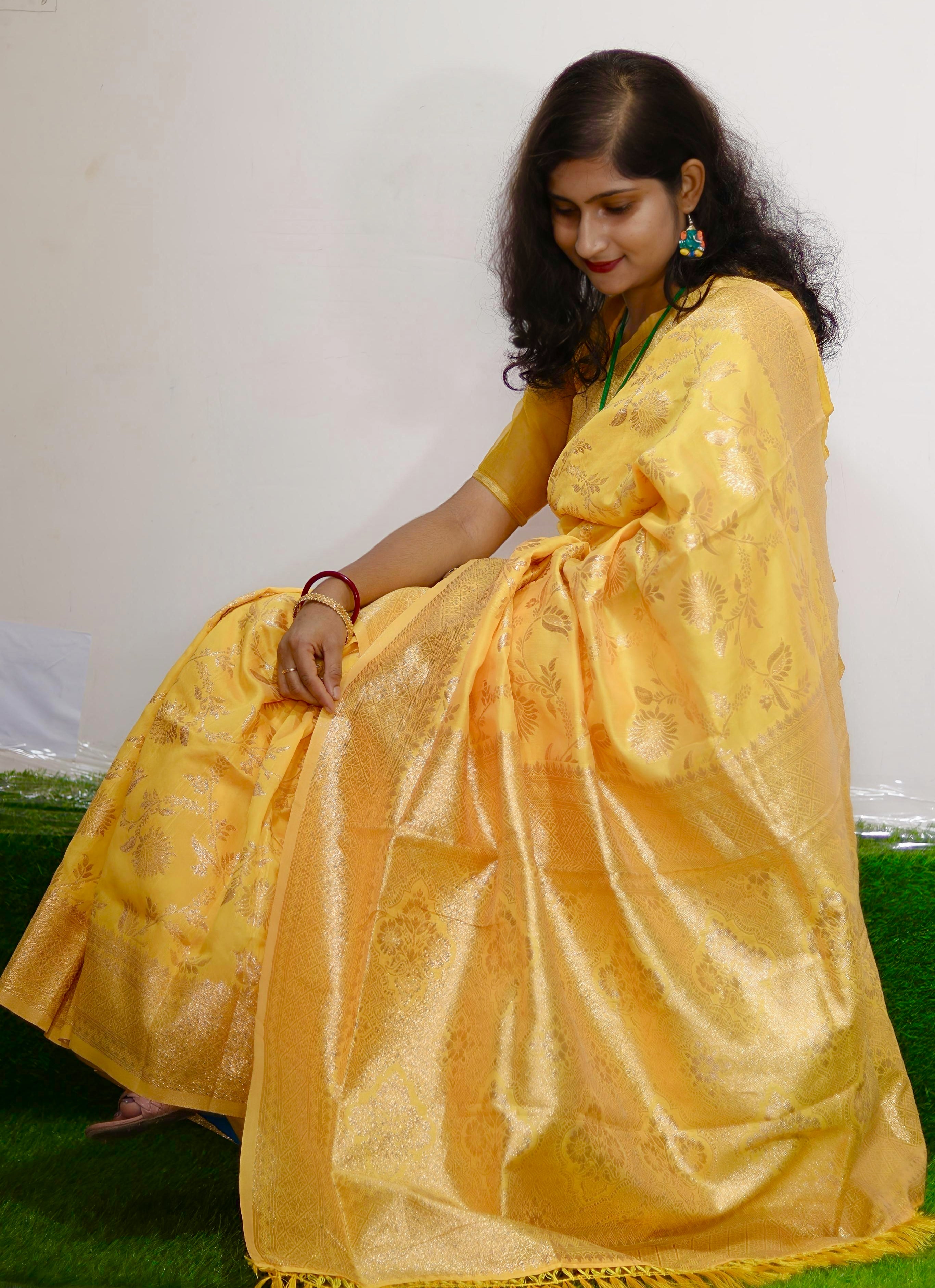 This stunning yellow Banarasi silk saree is beautifully crafted with rich golden zari weaving and floral motifs. The heavy pallu with tassels and matching blouse piece make it a perfect choice for weddings, festive occasions, and traditional functions.